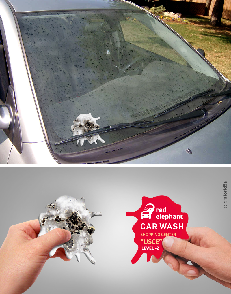 I have made this two-sided, bird-poop-shaped guerilla leaflet for the “Red Elephant” car wash, a company I had already created a logo for.